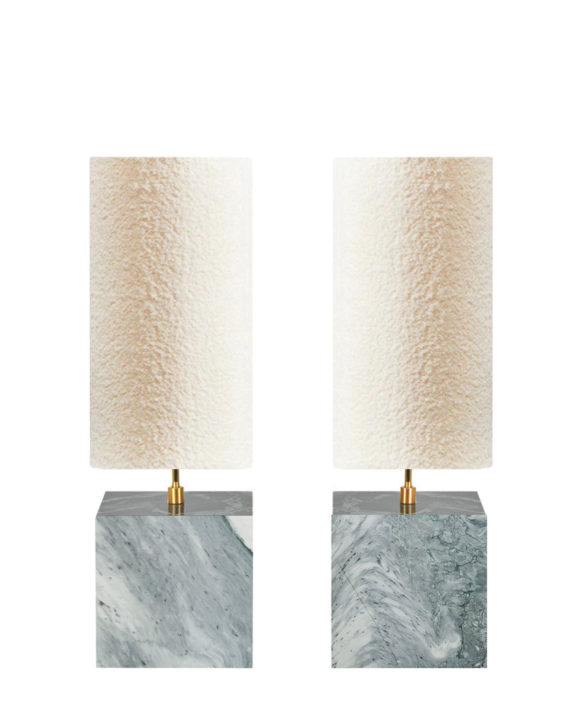 A rare and unique pair of Calacatta Turquoise Small Table Lamps with Boucle Shades with brass hardware. Brass dimmer on back face allows for expert light setting. The Coexist table lamp consists of a marble cube base and in this edition, the lamp shade is a wool boucle fabric, giving a lush texture to the lamps when on or off. These lamps use clean and pure geometry to attract the eye and create harmonious balance. Cut from the same slab of Calacatta Turquoise Honed Marble, this pair are exquisite as bedside lamps or in a living space with symmetrical sides. Each unique in regards to the veining of the stone but a pair because they were once one. These lamps are designed and manufactured locally in New York City.