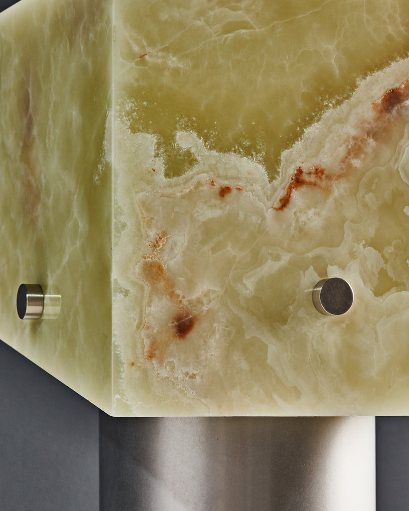 Elevate your space with the Mada Lamp, a harmonious blend of natural elegance and contemporary design. This sculptural piece features a pristine green onyx cube, delicately perched atop a sleek brushed aluminum cylinder. The translucent onyx emanates a warm, ethereal glow when illuminated, revealing its unique veining and rich, organic patterns that make each lamp truly one-of-a-kind. The minimalist silhouette is punctuated with subtle hardware detailing, emphasizing its architectural form and meticulous craftsmanship. This refined juxtaposition of raw stone and polished metal creates a bold yet sophisticated statement, perfect for modern interiors. Ideal as a standalone piece or paired to enhance ambient lighting, the Mada Lamp serves not just as a functional object, but as an artful expression of materiality and light. The lamp is touch activated through the base and has three dimmer settings.