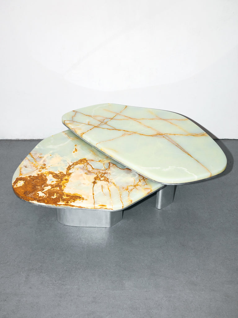 The Oni Coffee Nesting Tables are a study in balance and materiality. Crafted from rich green onyx, each tabletop reveals the stone’s natural veining, accented with golden and rust hues that make each piece unique. The asymmetrical shapes bring a sense of fluidity, enhancing the organic beauty of the stone. Resting on playful aluminum bases, the tables achieve a refined contrast between the warm, textured stone and the sleek, minimal metal. Sold as a set or individually. Size and shape customization is possible.