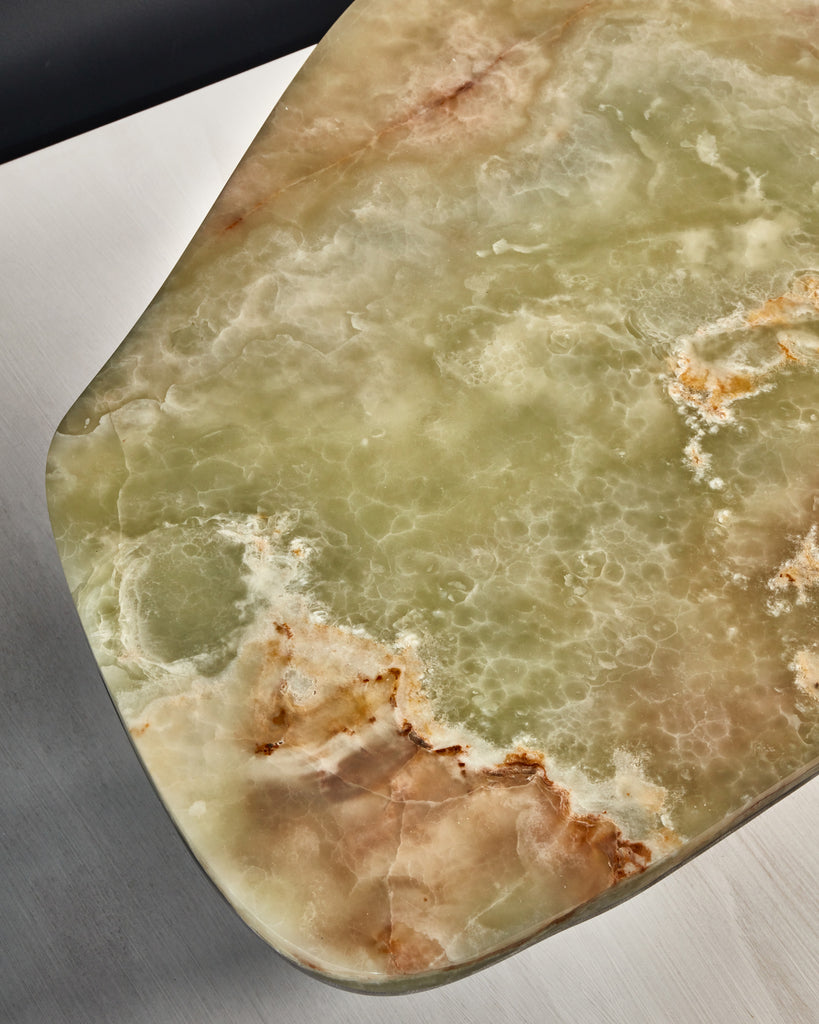Celebrating nature's inherent beauty, the Oni Coffee Table embraces the beauty of stone's natural veining. The Green Onyx top is elegantly supported by a brush-finished and hand-waxed aluminum base and playfully asymmetric legs that explore harmony and balance through proportions. The base can be customized in a different finish. The Oni Coffee Table is available in two sizes which can nest to create a dynamic larger assemblage.