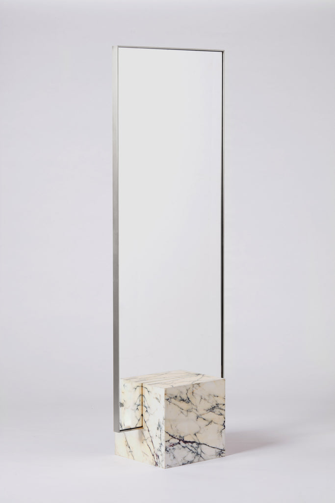 The Coexist Standing Mirror brings the intersection of glass with the richness of the cube base. The mirror is able to be assembled with no hardware - just pieces fitting together like a puzzle. The piece can stand alone or set up against a wall.